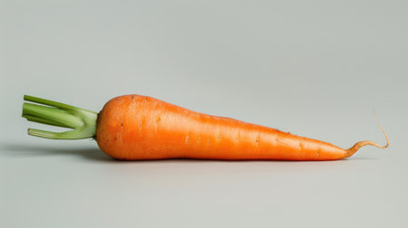 Freshly harvested orange carrot with vibrant green stems rests on a light surface. Its smooth texture and bright hue highlight the freshness and nutritional value of this vegetable.