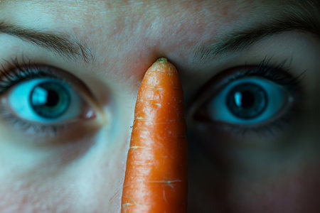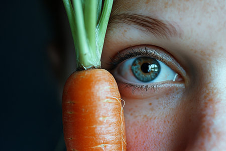 Person observing a carrot embracing healthy eating and dieting choices for wellbeing