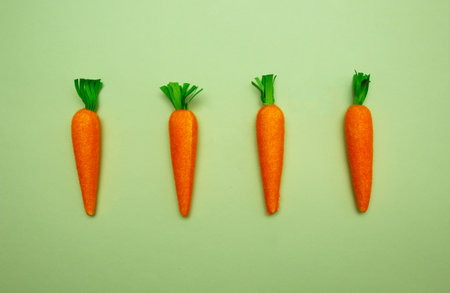 Four fake carrots on green background. Easter, spring holidays concept