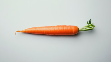 A vibrant orange carrot with green tops, set against a soft white background, ideal for promoting healthy food choices and nutrition.