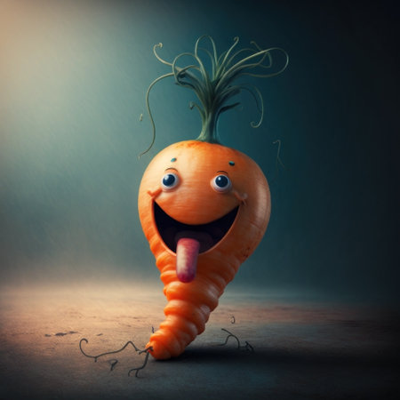 A delightful and whimsical cartoon carrot with a smiling face sits in lush green grass, embodying happiness and nature's bounty. Perfect for cheerful, playful themes.