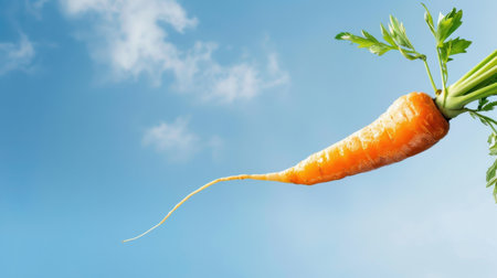 A striking image of a fresh orange carrot, suspended against a vivid blue sky, showcasing its vibrant green leaves, representing health and nature.