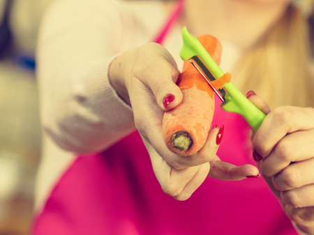 Woman peeling vegetables using food peeler. Cooking female preparing carrot before serving.