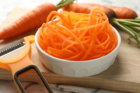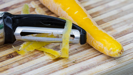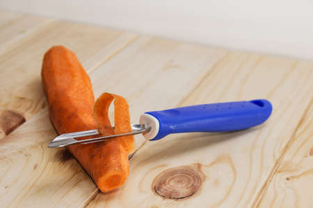 Peeled carrot with peeler lies on the wooden board