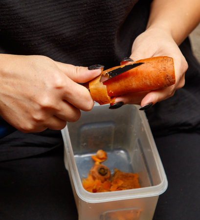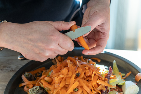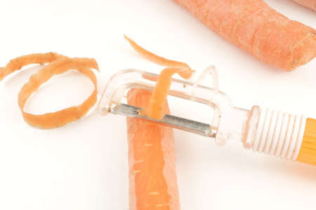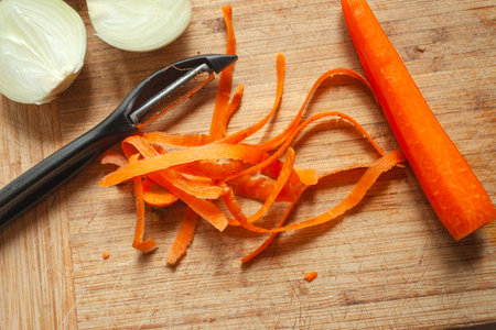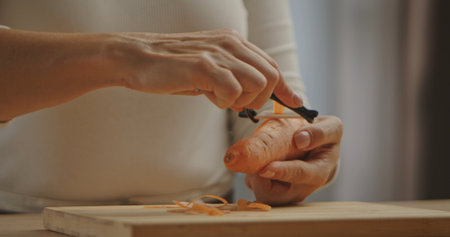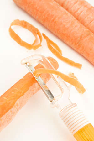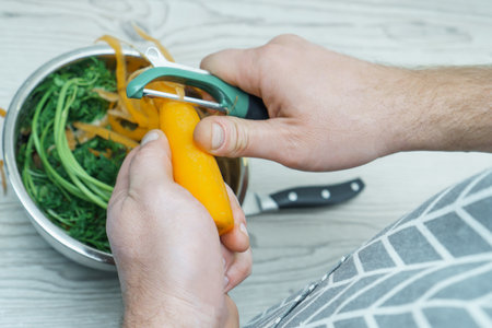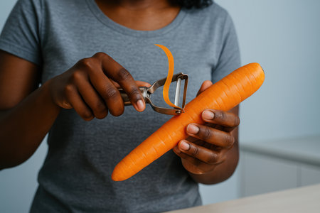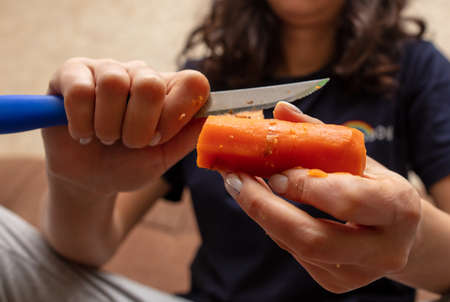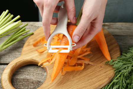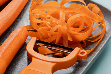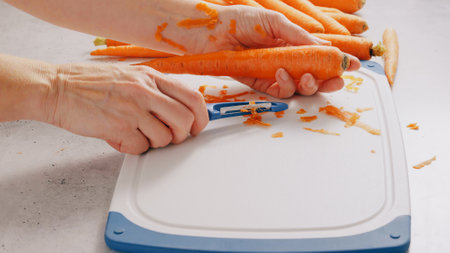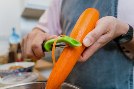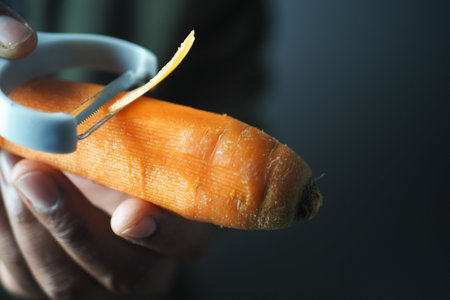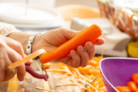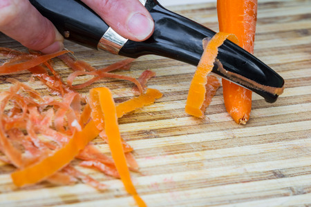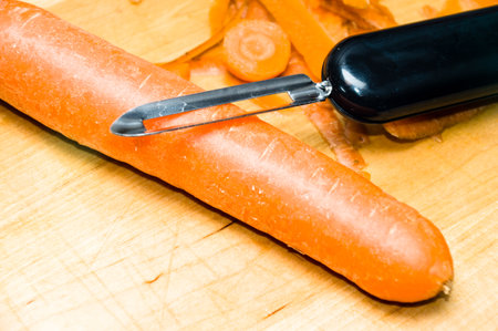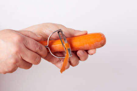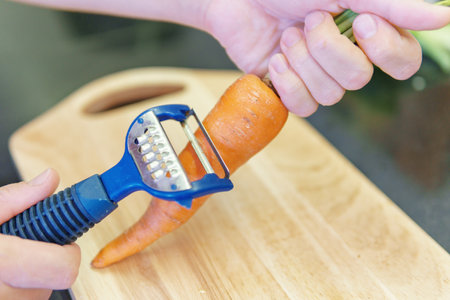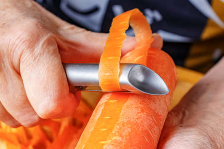 Peeling a fresh carrot with a vegetable peeler in a kitchen