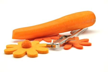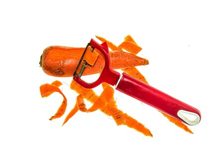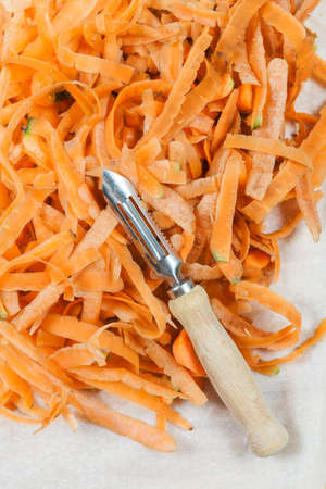 Heap of carrot peel on a white paper with carrot peeler in front