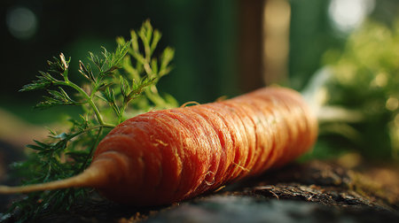 In a cozy, dimly lit kitchen, a chef skillfully slices a vibrant orange carrot with a sharp knife, showing culinary precision and the beauty of fresh ingredients for a delightful dish.