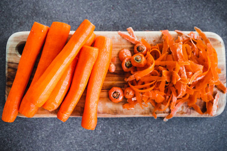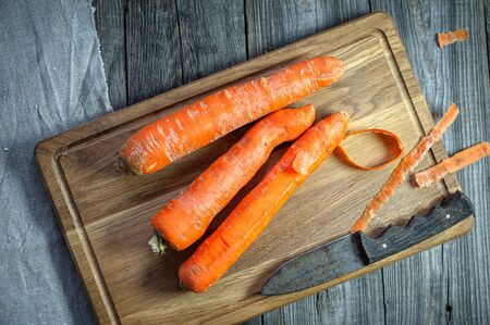 close-up of fresh carrots getting peeled on wooden chopping board, concept of simple natural healthy ingredients