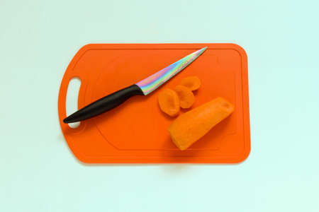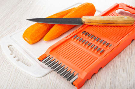 Kitchen knife and two peeled carrots on plastic cutting board, orange color grater on wooden table
