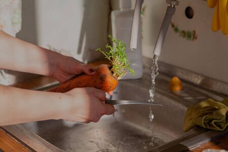 Sprouted carrot in female hands against the background of a kitchen sink and a tap with pouring water. Kitchen knife in hand to cut carrot sprouts