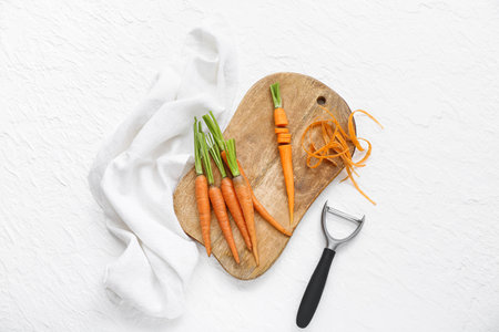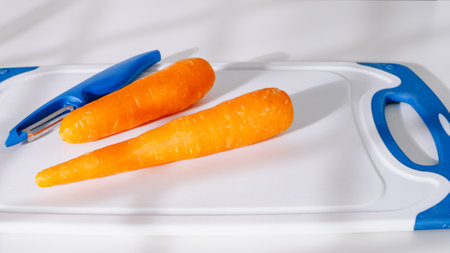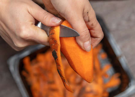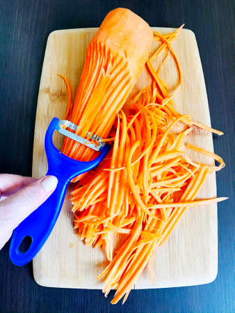 Female hands peel carrots with a vegetable peeler on a white board on a light table.Cleaning fresh carrots before serving and cooking.Peels carrots from the peel. high quality photo