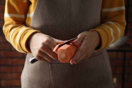 Woman peeling fresh carrot with knife indoors, closeup