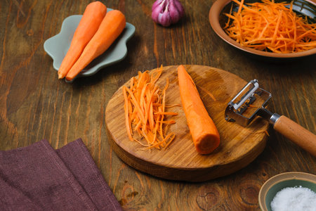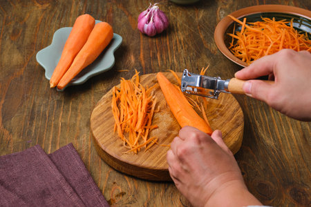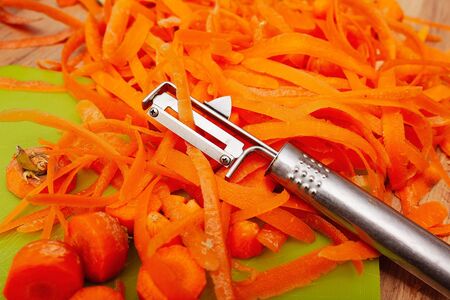 Cutting carrots into strips with a special knife on a wooden board. Preparing ingredients for salads or canning. Step-by-step recipes