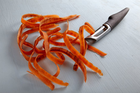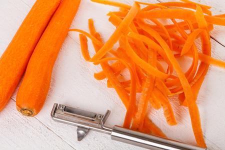 Carrot peelings and black metal peeler on a light wooden table