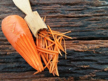 Grated carrot on a wooden background.