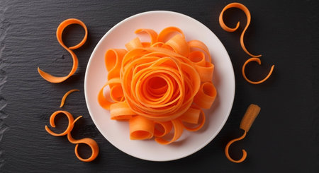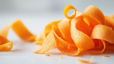 Carrot shavings curled elegantly on a bright white surface, emphasizing their delicate texture.