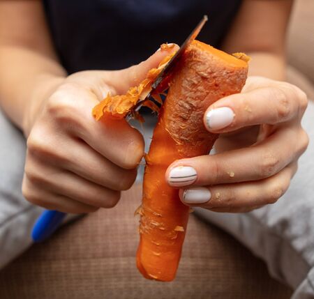 Peeling carrots close-up. The concept of a healthy diet. Vegetarianism.