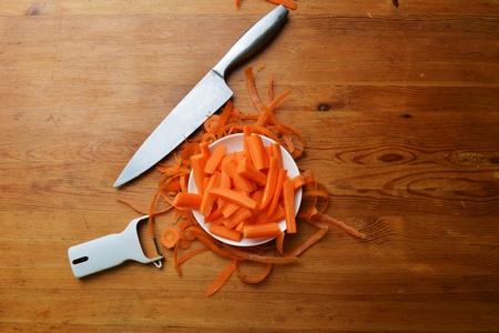 knife and chopped carrots on a cutting board on the table