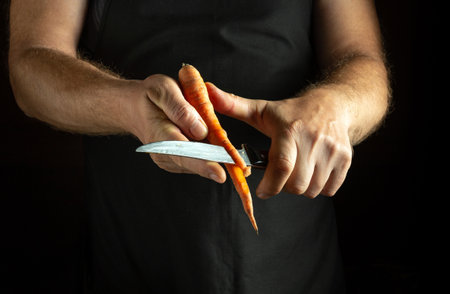 The chef peels boiled carrots with a knife