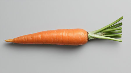 Fresh organic carrot with green leaves on light background.