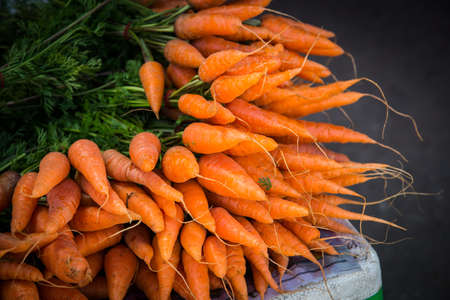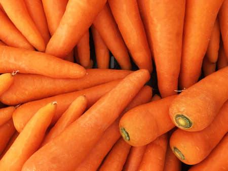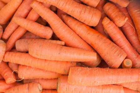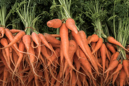 Pile of fresh ripe carrots at display on farmers market. Food background