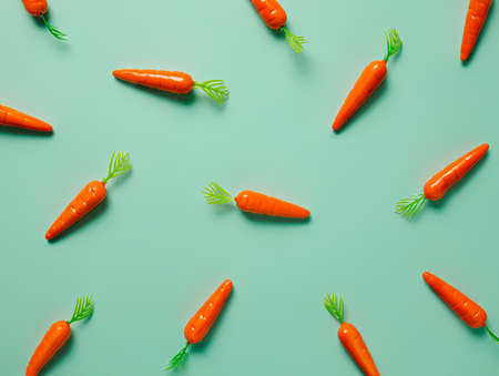 Pattern made with miniature baby carrots on pastel green background. Minimal Easter or vegetable food concept. Flat lay, top view.