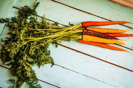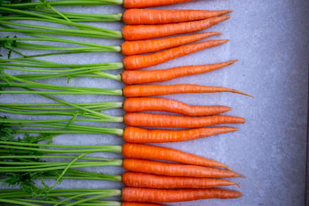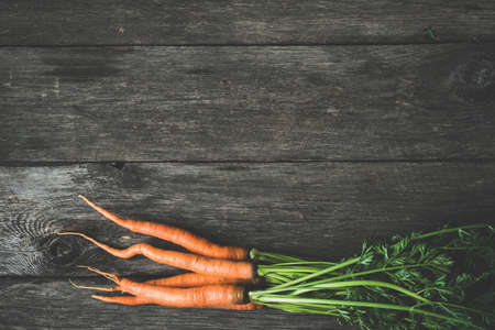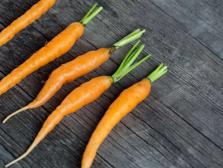 Orange small young carrots on rustic weathered wooden table. Harvest of Organic vegetables .