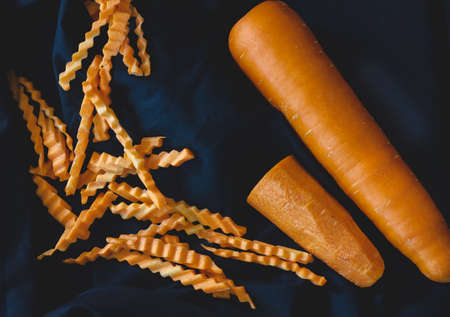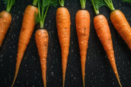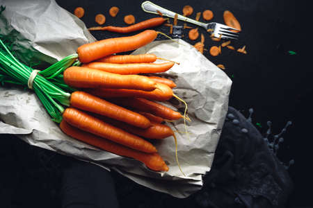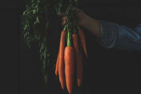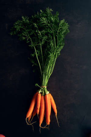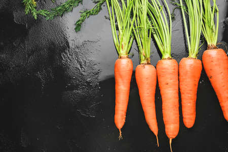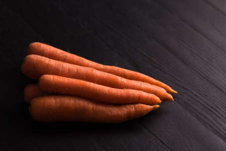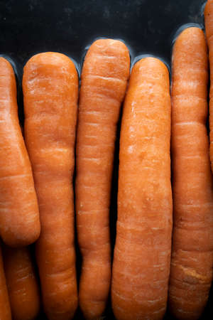 Healthy, juicy, fresh carrots in a strong contrast of orange and black background.