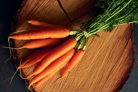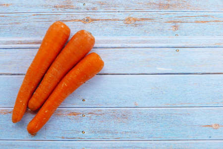 Three young carrots lie on a wooden cutting board. Fresh carrots on a wooden table. Harvest from the garden. Vegetables Vitamins Keratin. Freshly washed whole carrots background.