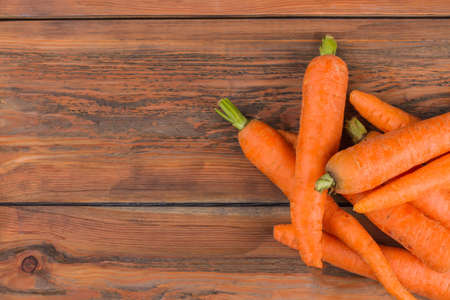 Pile of ripe washed carrots. Wooden table and copyspace.