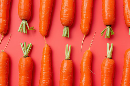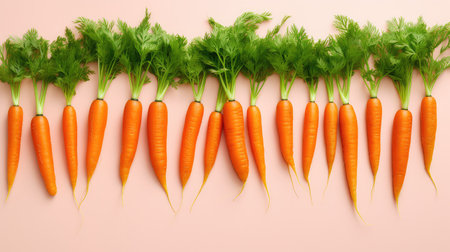 Fresh organic carrots arranged in a row on a vibrant pink background with tops pointing up, healthy vegetable concept