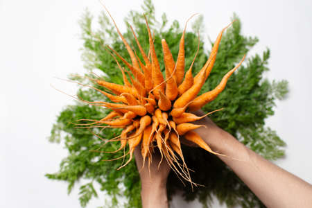 Top view of male hands holding bouquet of fresh carrots on background of white.