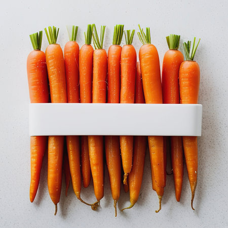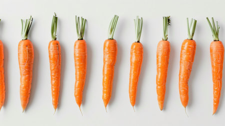 Bright orange carrots arranged in a line on a white background, emphasizing their uniformity and freshness.