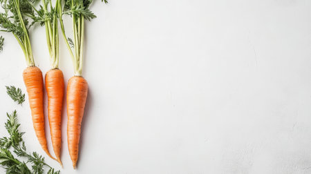 Three freshly harvested orange carrots with vibrant green tops are arranged on a bright white background, showcasing their natural color and freshness.