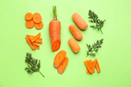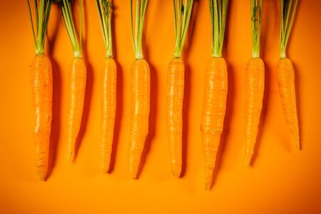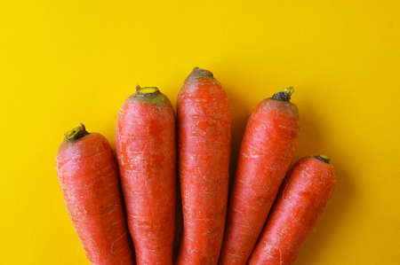 Natural organic carrot lies on yellow background. Vegetable vitamin and keratin. Top View. Agriculture concept.