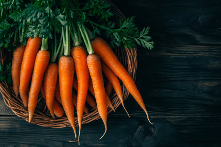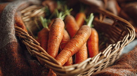 This image features a rustic basket filled with freshly harvested carrots, showcasing their vibrant color and earthy texture. Ideal for food and gardening themes.