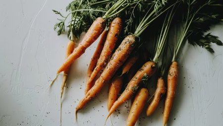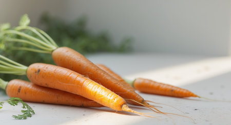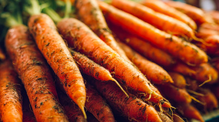 Juicy, orange carrots nestled in rich soil evoke the freshness of a bountiful garden harvest, highlighting earthy textures and vibrant vegetable appeal.