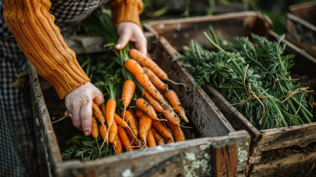 Farmer Harvesting Fresh Organic Carrots from Wooden Crates in Rustic Farm Setting