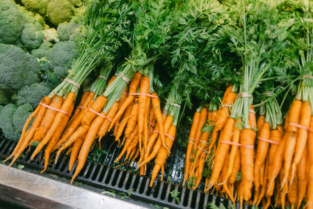 Bunches of orange carrots with green tops sit next to broccoli at a bustling market, showcasing fresh produce.
