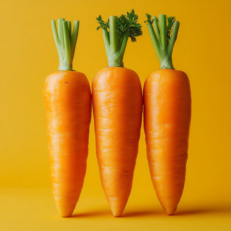 Three fresh carrots against bright yellow background highlighting vibrant color and texture.