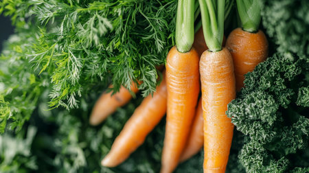 Close-up of fresh carrots with vibrant green tops, surrounded by curly kale, highlighting healthy, organic produce and natural vegetables.