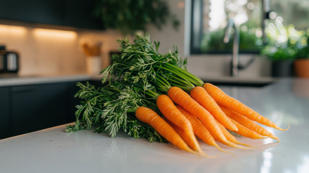 A bunch of vibrant, fresh organic carrots with green tops laid on a modern kitchen counter, ready for cooking or juicing.