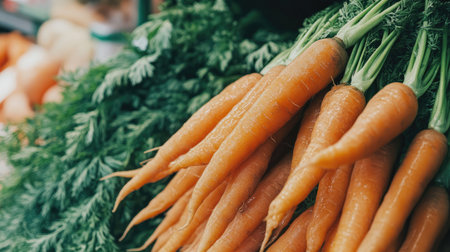 A close-up of whole fresh carrots stacked neatly on a grocery store display. Their bright orange color is highlighted by the crisp, leafy greens attached to the tops.