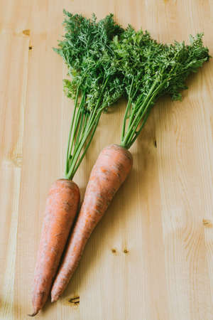 Fresh organic carrots with green leaves on wooden background. Vegetables. Healthy food concept