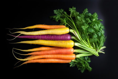 A vibrant bunch of colorful carrots placed on a sleek black surface. Ideal for food-related projects and healthy eating concepts.