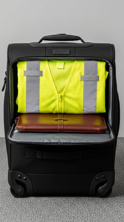 A well-organized suitcase with business items like a laptop and formal clothes. Ideal for travel, work, or productivity themes.