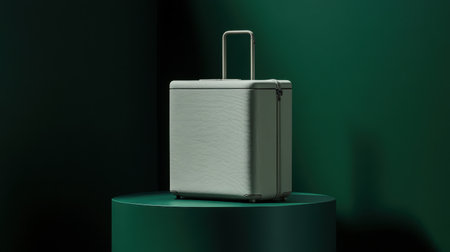 Discover a chic and minimalist carry-on luggage piece displayed on a pedestal against a dark green backdrop, perfect for travel enthusiasts and design lovers.