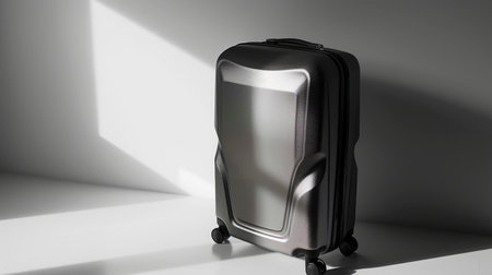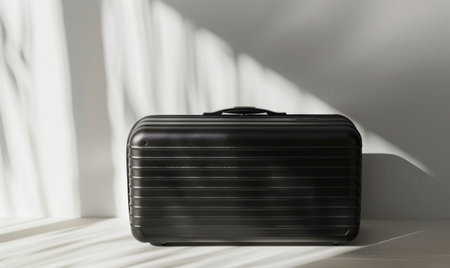 A modern metallic suitcase rests on a smooth surface, casting a shadow as sunlight filters through a window, highlighting its clean lines and minimalist design.