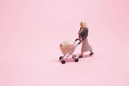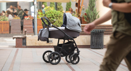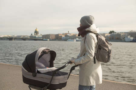 Back view of mother walking with her baby in stroller. Grey stroller outside, sunset