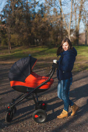 Young woman in blue coat walking in autumn park with little child baby in orange baby carriage, tea or coffe on fall nature, green trees. Mother and kid. Parenthood, love, parents, children concept